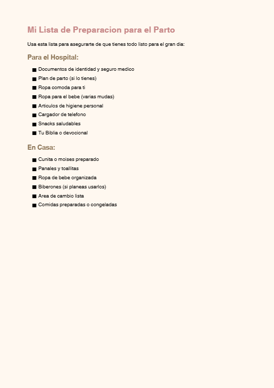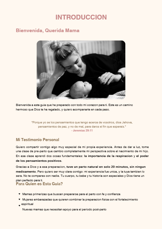 ¿Estás embarazada y sientes miedo? ¿Te abruman los mitos y comentarios negativos? Esta guía te preparará espiritualmente, mentalmente y físicamente para vivir tu parto con fe y tu post-parto con paz. Incluye técnicas de respiración, devocionales, oraciones, plan nutricional y ejercicios prácticos. Escrita por una mamá que tuvo un parto natural de solo 20 minutos.